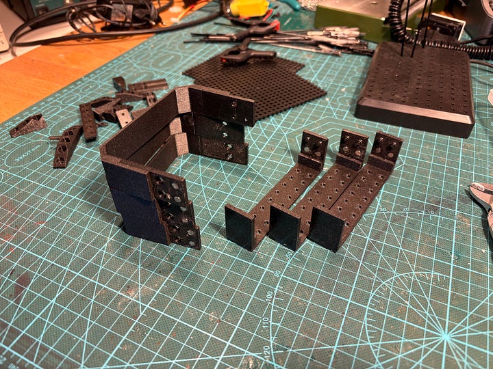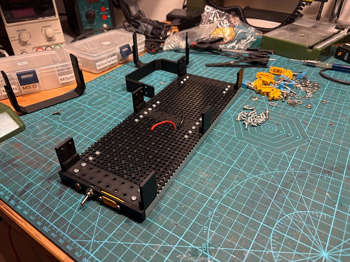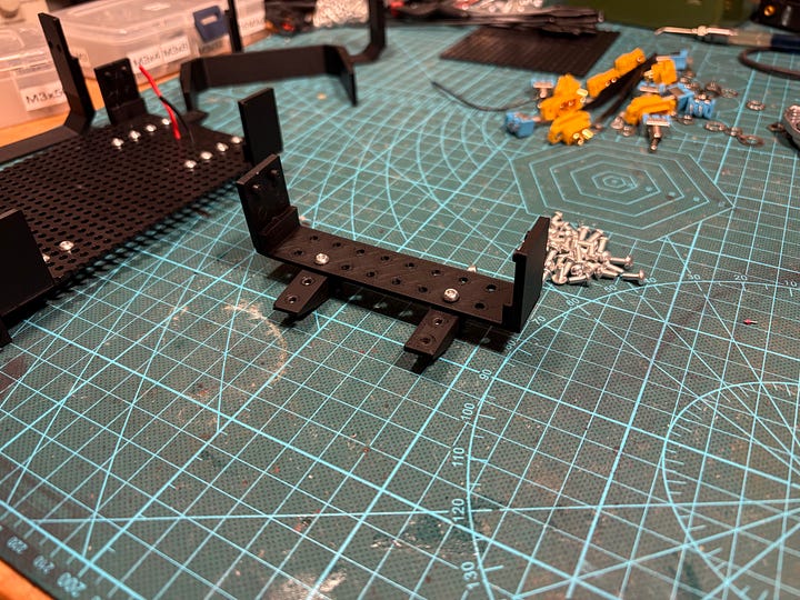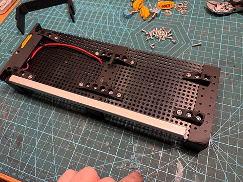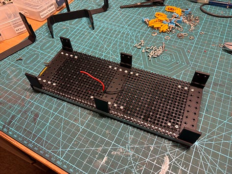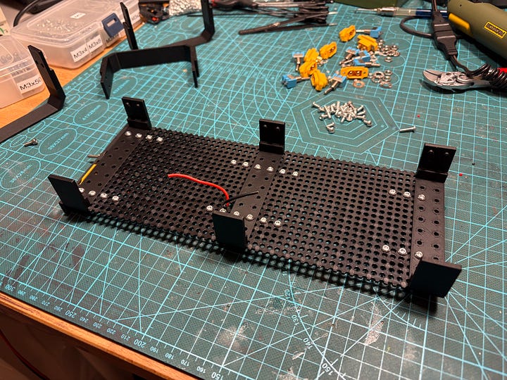 The front panel has extrusion that will face bottom of unit to hide the soldering work, this make sit enclosed from three sides - we do not have to worry that much about hiding it. It is screwed together with one totemmaker perforated board (5mm grid of 3mm holes) and bottom side of one U-gate.