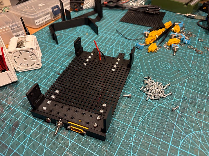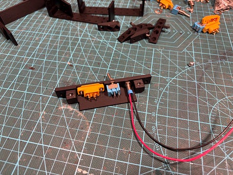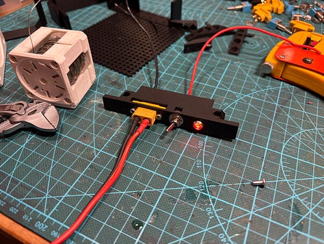 Assembly starts with the front panel, which contains standard XT60 panel connector, switch and 12V red LED. These were sourced from Amazon.